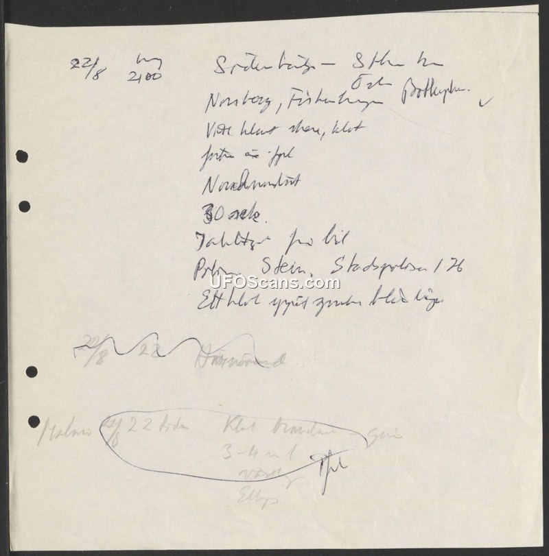 This handwritten document records a sighting that occurred on August 22 at 21:00 hours in the vicinity of Norberg and Fagersta, Sweden. The report notes the observation of a white light that subsequently turned green. The duration of the event was recorded as 30 seconds. The report mentions a police officer, Polis Stein, identified as Stadspolis 176. The document contains additional fragmented notes, including references to Malmö and a time of 22:00, though the context of these secondary notes is unclear.