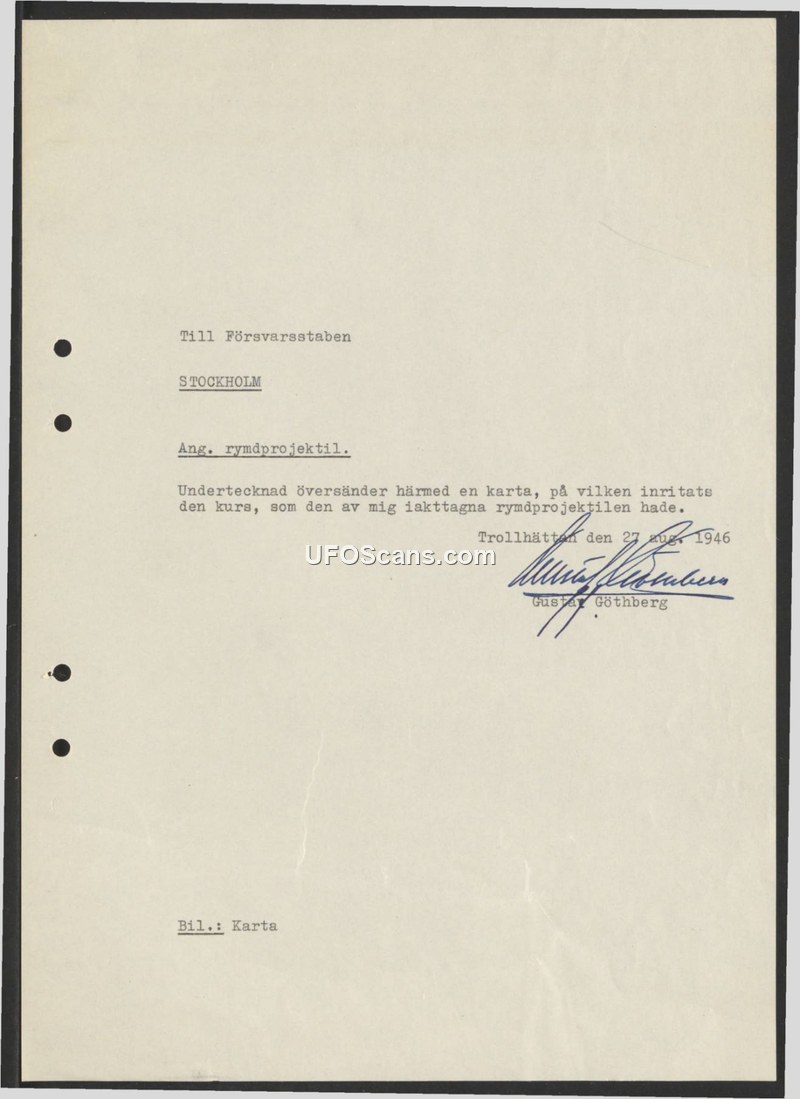 Correspondence regarding space projectile sighting — Trollhättan, August 27, 1946