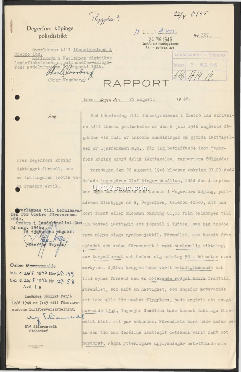 A police report from August 1946 detailing an engineer's observation of a low-flying, torpedo-shaped object with a rotating disc over Degerfors, Sweden. The document highlights the military's interest in such reports during that period.