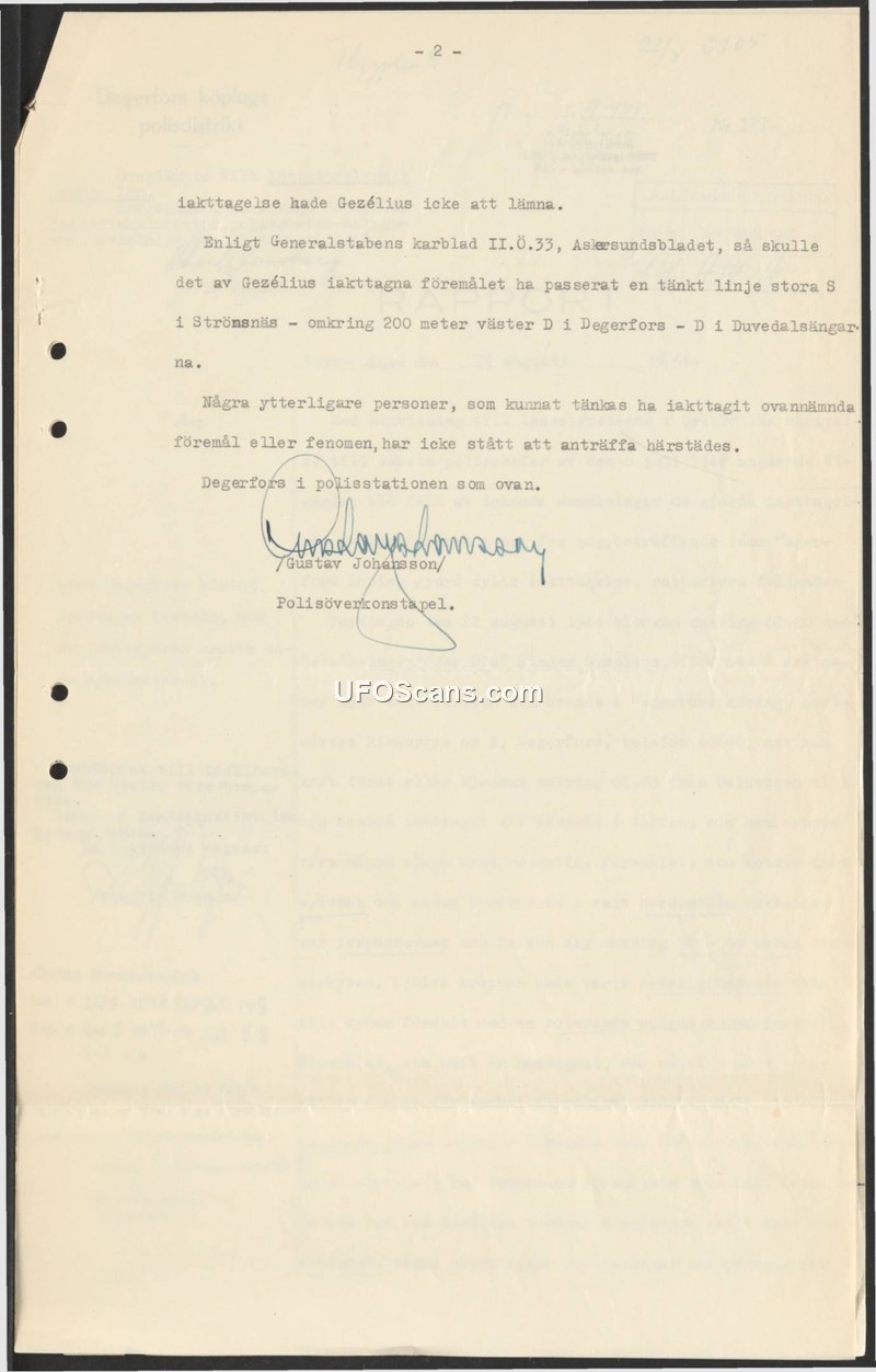 A police report from Degerfors, Sweden, documenting a sighting by a witness named Gezélius. The police were unable to find any other witnesses to corroborate the event.