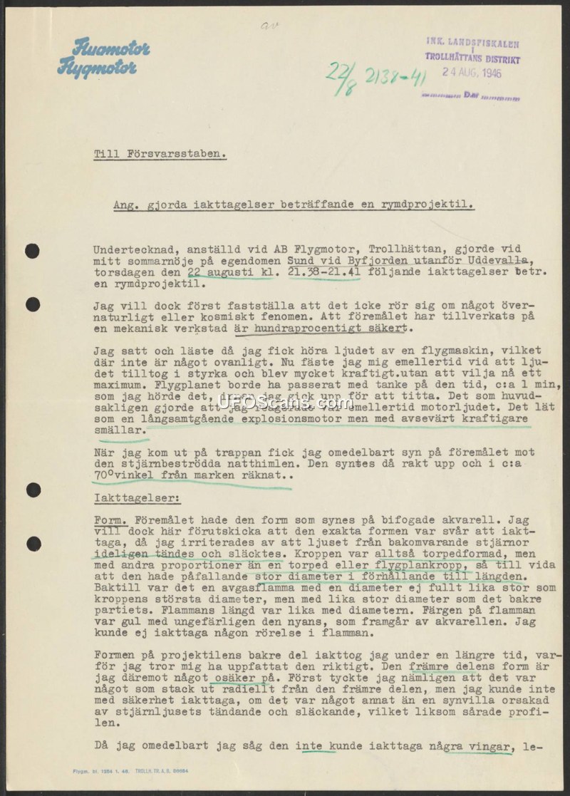 On August 22, 1946, an employee of AB Flygmotor in Trollhättan submitted a report to the Swedish Defence Staff (Försvarsstaben) regarding a sighting of a 'space projectile' (rymdprojektil). The witness, who was at their summer residence at Sund by the Byfjorden near Uddevalla, observed the object between 21:38 and 21:41. The witness explicitly stated their conviction that the object was not of supernatural or cosmic origin, but was definitively a product of a mechanical workshop. The observation began when the witness heard the sound of an aircraft, which grew in intensity without reaching a maximum. The sound was described as resembling a slow-moving explosion engine, but with significantly more powerful bangs. Upon exiting to the porch, the witness observed the object against the starry night sky at an angle of approximately 70 degrees from the ground. The object was described as torpedo-shaped, though with a notably large diameter in relation to its length. A yellow exhaust flame was visible at the rear, with a diameter equal to the rear of the body and a length equal to its diameter. The witness noted that they could not observe any movement in the flame itself. While the witness was confident in the shape of the rear of the object, they were uncertain about the front, noting a potential radial protrusion that might have been an optical illusion caused by the flickering of background stars. The witness confirmed that no wings were visible. The report includes a reference to an attached watercolor painting illustrating the object's form.