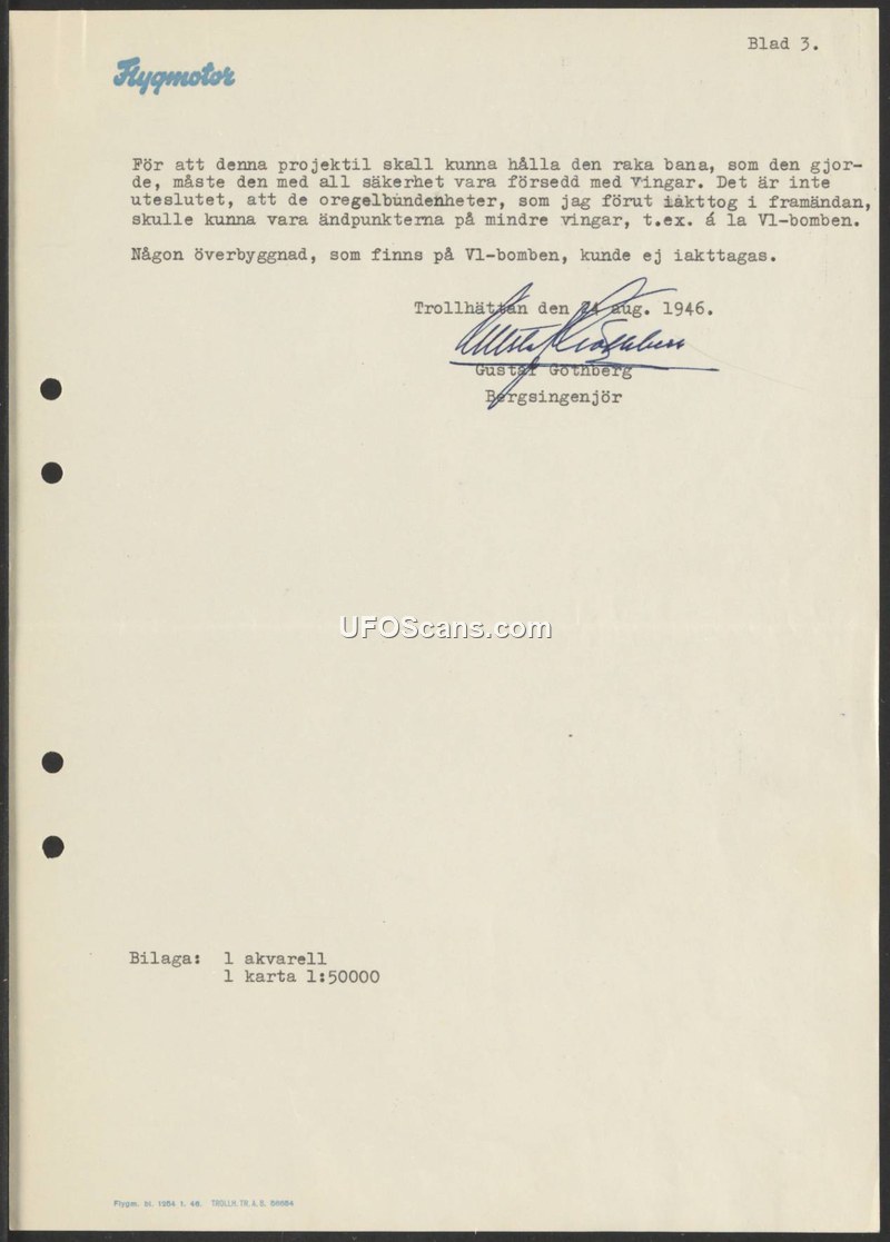 This document, dated August 24, 1946, and authored by Bergsingenjör (Mining Engineer) Gustaf Göthberg at Flygmotor, provides a technical assessment regarding the flight stability of a projectile. The author asserts that in order for the projectile to maintain the straight trajectory previously observed, it must be equipped with wings. He posits that certain irregularities he had previously noted at the front end of the object could be the attachment points for smaller wings, drawing a comparison to the design of the V1-bomb. Furthermore, the author explicitly states that no superstructure, such as the one present on the V1-bomb, was observed on this projectile. The document concludes with a list of two enclosures: one watercolor painting and one map at a scale of 1:50,000.
