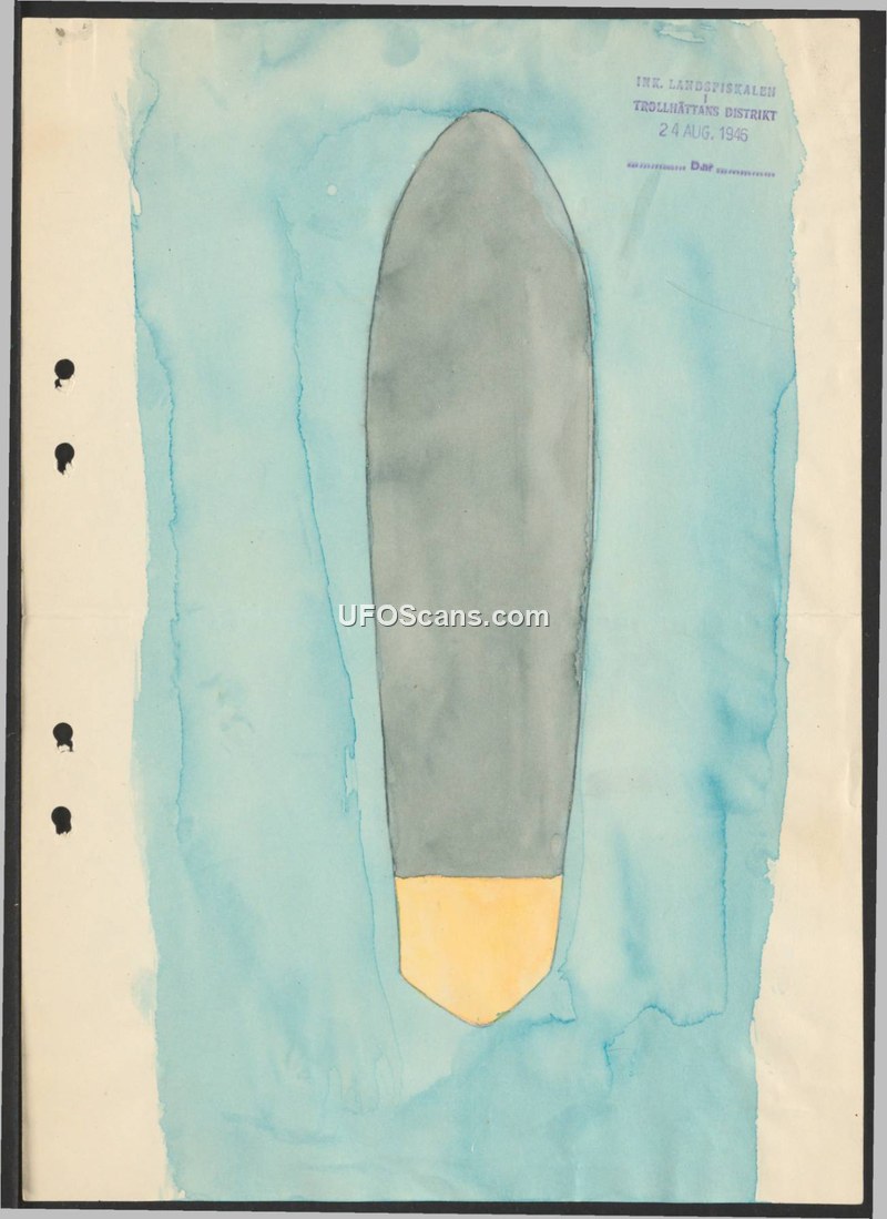 This document consists of a visual record, specifically a drawing or illustration, filed by the office of the Landsfiskal (a Swedish district police/prosecutor official) in the Trollhättan district. The document is dated August 24, 1946. The primary content is an illustration of an unidentified object, depicted as an elongated, grey, bullet-shaped form with a distinct yellow or light-colored base. There is no accompanying text describing the circumstances of a sighting, the behavior of the object, or any witness testimony. The document serves as an official record of an observation reported to the local authorities in Trollhättan during the period of the 1946 'ghost rocket' sightings in Sweden.