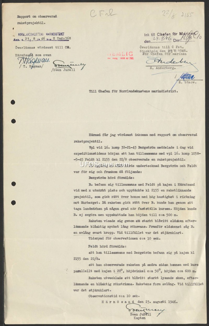 This document is a formal military report from the Norrland Coast Naval District, dated August 23, 1946, concerning the sighting of an unidentified rocket-like projectile. The incident occurred on the evening of August 22, 1946, at 21:55 in Härnösand, Sweden. Two military personnel, identified as Bergström and Feldt from the 16th Company, reported observing the object while standing on a quay. According to the report, the object moved at high speed across the harbor. Bergström noted the object traveled toward Murberget and estimated its altitude at approximately 500 meters. Feldt, observing from a different position, estimated the altitude at 600 meters and noted the object's flight path was parallel to the quay at a 20-degree angle. Both witnesses described the object as having a bright, bluish light, an elongated black body, and a long, bluish smoke trail. The sky was clear at the time of the observation, which lasted approximately 10 seconds. The report was compiled by Captain Sven Jurell and forwarded to the Chief of the Navy.