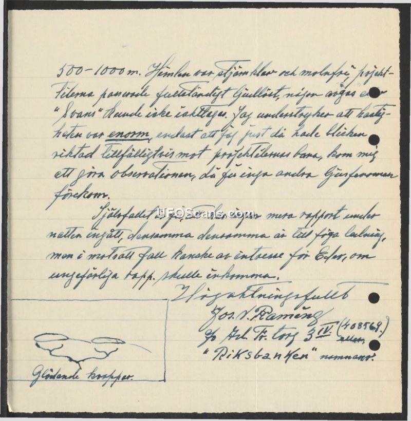 This document is a handwritten report by an individual named Jos. V. Rameng regarding an aerial sighting. The author describes observing glowing objects at an altitude estimated between 500 and 1000 meters. The observation occurred under clear, starry, and cloudless conditions. The author notes that the objects moved in a perfectly silent manner. The author stresses that the sighting was purely accidental, occurring only because they happened to be looking in the direction of the objects' path at that moment, and that no other witnesses were present. The author mentions that they have not received any further reports during the night, but offers this information in case it might be of interest should similar reports be received. The document includes a small sketch of the objects, labeled 'Glödande kroppar' (Glowing bodies). The author signs the document with a reference to 'Riksbanken'.