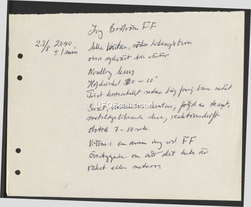 A handwritten report of an aerial sighting over Lilla Värtan, Sweden, on August 23, 2040. The witnesses observed a black, metal-like object with reactor propulsion that moved horizontally before descending.