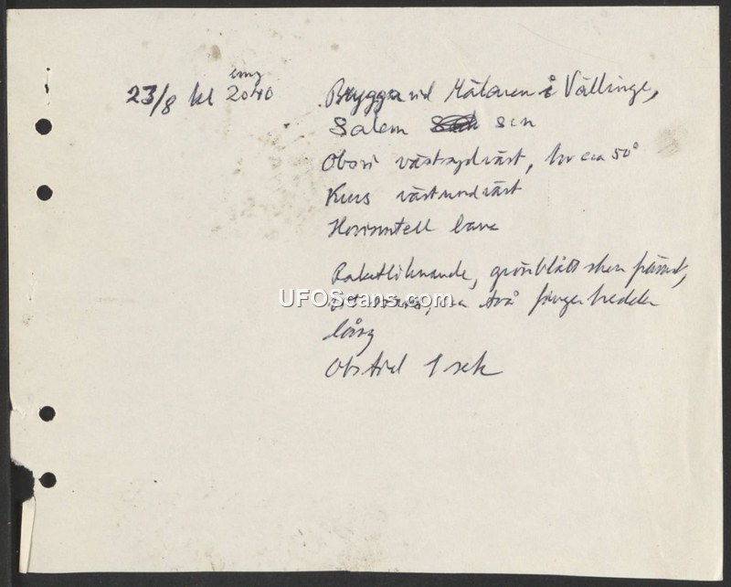 A handwritten report of a one-second sighting of a green-blue, rocket-like object in Vällinge, Sweden, on August 23 at 20:40.