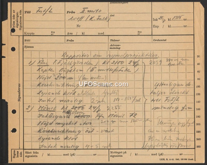 A 1945 Swedish military report documenting two sightings of 'space projectiles' observed on August 24, 1945, by military personnel.