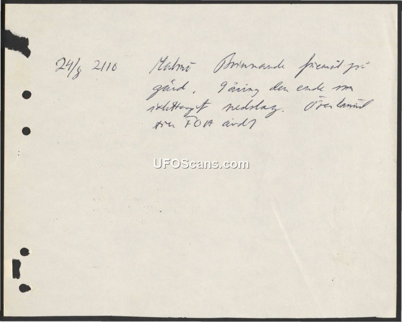 A handwritten note documenting a report of a burning object at a farm in Malmö, Sweden, on August 24th at 21:10, which was subsequently forwarded to the FOA.