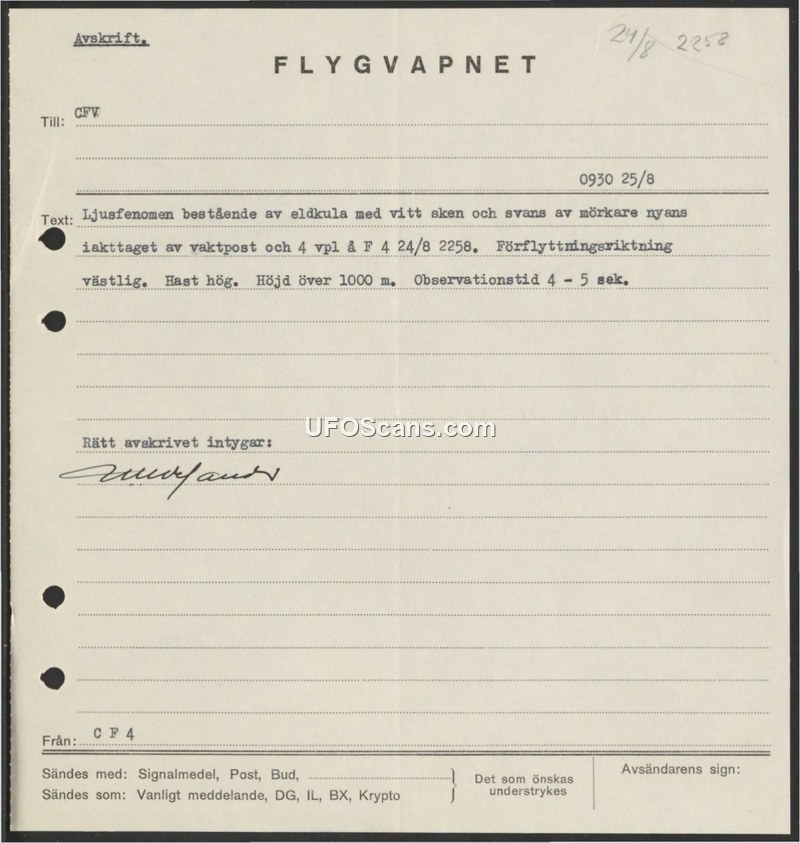 A Swedish Air Force report detailing a 1958 sighting of a high-speed, white-light fireball with a dark tail observed by military personnel at F 4.