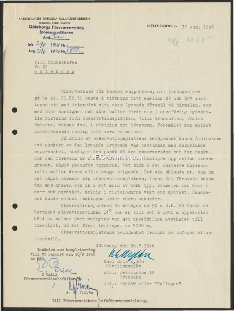 On August 30, 1946, Civil Engineer Karl Erik Kylén of Aktiebolaget Svenska Kullagerfabriken submitted a formal report to the Chief of Staff of the 32nd Defense District in Gothenburg regarding an aerial sighting. The incident occurred on the evening of Saturday, August 24, 1946, at 20:58:30. Kylén observed an intensely bright white light moving at high speed without any audible noise. The object traveled in a south-westerly direction from his observation point at Villa Grankullen in Västra Bodarne. According to the report, the object appeared between two spruce trees, moved in a nearly horizontal or slightly ascending path, and eventually disappeared behind a tree and into a dark cloud. The sky was clear in the north and northwest, but cloudy in the west and southwest. The observation lasted only a few seconds. Kylén explicitly stated his belief that the object was not a meteor. Using an estimated elevation angle of 14 degrees and an estimated cloud height of 800 to 1000 meters, he calculated the distance to the object at the time of the first sighting to be approximately 5000 meters. The report was submitted as a supplement to a previous report dated August 26, 1946, and was forwarded to the Air Defense Department of the Defense Staff.