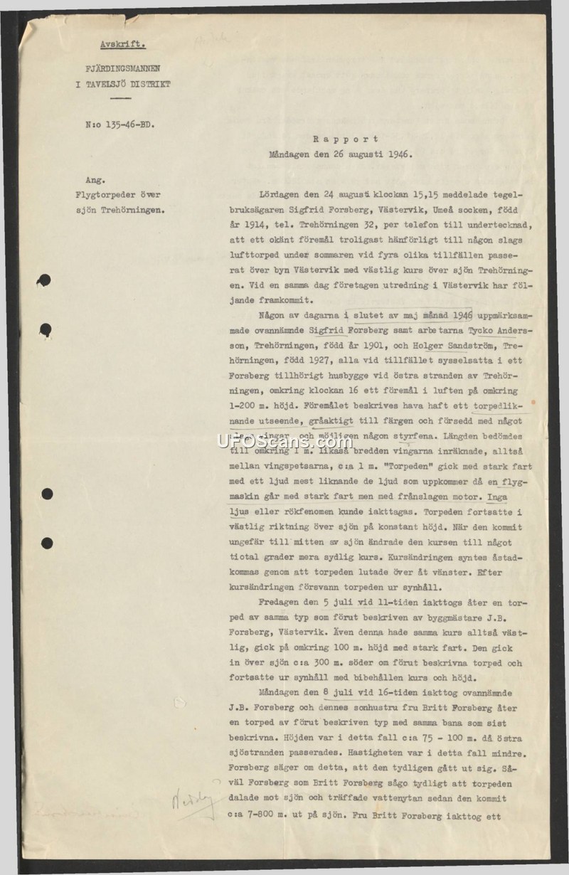 This report, dated August 26, 1946, from the Fjärdingsman (district police officer) of Tavelsjö, details multiple sightings of unidentified aerial objects near Lake Trehörningen in Sweden. The primary witness, brickyard owner Sigfrid Forsberg, reported that he and two workers, Tycko Andersson and Holger Sandström, observed an object in late May 1946 while working on a building project. The object was described as torpedo-shaped, grayish in color, approximately one meter in length and width, and flying at an altitude of 100-200 meters. It produced a sound similar to an aircraft engine with the motor turned off. The object traveled westward, changed course slightly to the south by tilting, and disappeared. Subsequent sightings were reported by building contractor J.B. Forsberg on July 5 and July 8, 1946. On the latter date, J.B. Forsberg and his daughter-in-law, Britt Forsberg, observed the object flying at a lower altitude (75-100 meters) and at a slower speed before it descended and struck the surface of the lake approximately 700-800 meters from the shore. The report characterizes these objects as likely being some form of 'air torpedo'.