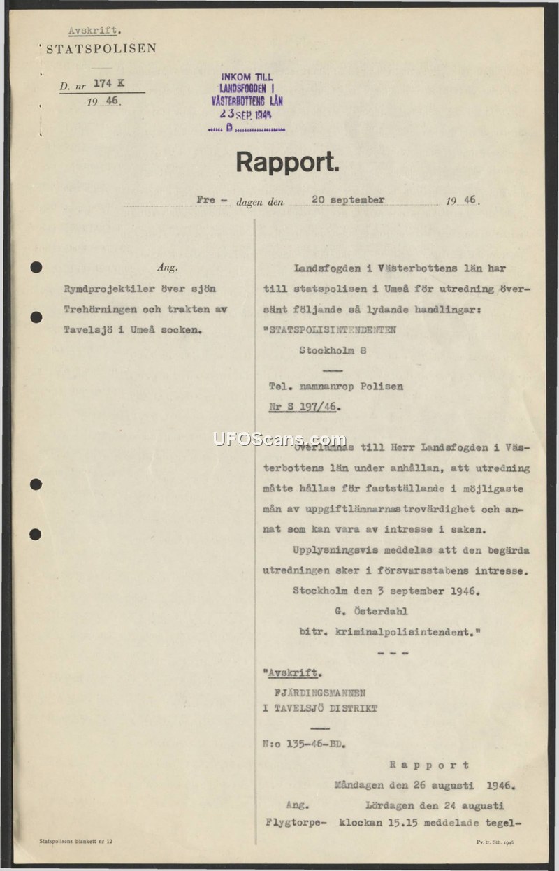 This document is a report from the Swedish State Police (Statspolisen), dated September 20, 1946, concerning reports of 'space projectiles' (rymdprojektiler) observed over Lake Trehörningen and the vicinity of Tavelsjö in Umeå parish. The document acts as a formal request from the State Police in Stockholm to the County Sheriff (Landsfogden) of Västerbotten County. The State Police instruct the Sheriff to conduct a thorough investigation into the incident, specifically requesting an assessment of the credibility of the witnesses and the collection of any other information that might be of interest regarding the case. The document explicitly states that this investigation is being requested in the interest of the Swedish Defense Staff (Försvarsstaben). The report references an earlier document, N:o 135-46-BD, which appears to be a report from the local district constable (Fjärdingsmannen) in Tavelsjö regarding an event that occurred on Saturday, August 24, 1946, at 15:15. The document provides no further details on the nature of the projectiles or the outcome of the investigation.