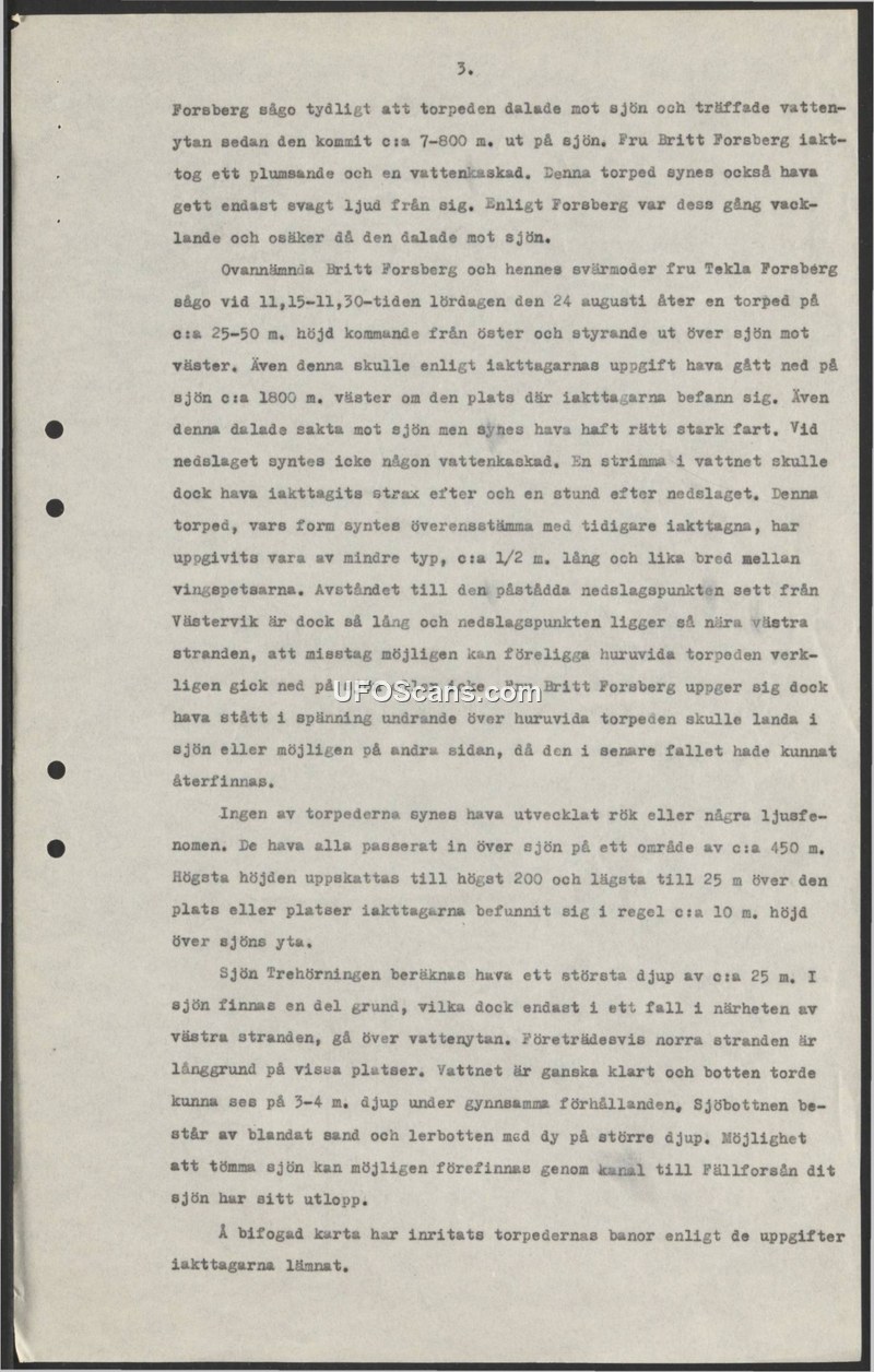 This document, which appears to be page 3 of a larger report, details eyewitness accounts of unidentified torpedo-like objects observed at Lake Trehörningen in Sweden. On Saturday, August 24, between 11:15 and 11:30, witnesses identified as Britt Forsberg and her mother-in-law, Tekla Forsberg, observed an object descending toward the lake from an altitude of approximately 25 to 50 meters. The object was described as traveling from the east toward the west. The witnesses estimated the object to be about 0.5 meters long and noted that it appeared to have a wobbling, uncertain flight path. Unlike a previous sighting mentioned in the text, this specific event did not produce a water splash, though a streak in the water was reportedly observed shortly after the impact. The report notes that the distance from Västervik to the alleged impact site is significant, and because the site is near the western shore, there is uncertainty regarding whether the object actually entered the water or if the witnesses were mistaken. The document further describes the physical characteristics of Lake Trehörningen, noting a maximum depth of 25 meters, clear water, and a bottom composed of sand, clay, and mud. It concludes by mentioning that an attached map illustrates the flight paths of the torpedoes based on the information provided by the witnesses.