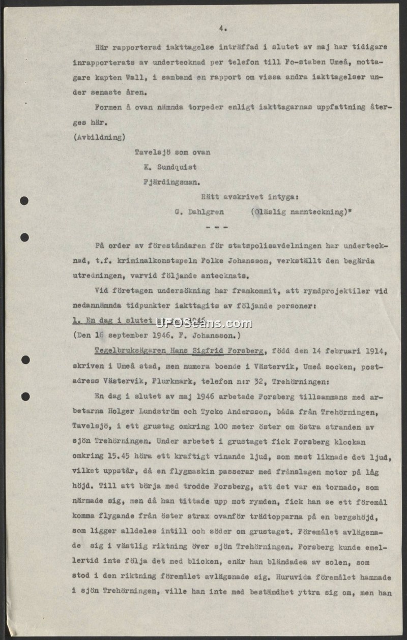 This document is an official investigation report dated September 16, 1946, authored by acting criminal constable Folke Johansson of the State Police Department. The report details an inquiry into sightings of 'space projectiles' reported in the Umeå region. The primary incident described occurred in late May 1946, involving Hans Sigfrid Forsberg, a brickworks owner, and two workers, Holger Lundström and Tycko Andersson. While working in a gravel pit approximately 100 meters east of Lake Trehörningen at 15:45, Forsberg heard a powerful, whining sound, which he compared to an airplane flying at low altitude with its engine turned off. Initially suspecting a tornado, Forsberg looked up and observed an object flying from the east, passing just above the treetops of a nearby hill. The object continued in a westerly direction over Lake Trehörningen. Forsberg was unable to track the object further because he was blinded by the sun, which was positioned in the direction the object was traveling. He could not definitively state whether the object crashed into the lake. The document also references a prior report made by telephone to Captain Wall at the Umeå Defense Staff (Fo-staben) regarding this and other recent sightings.