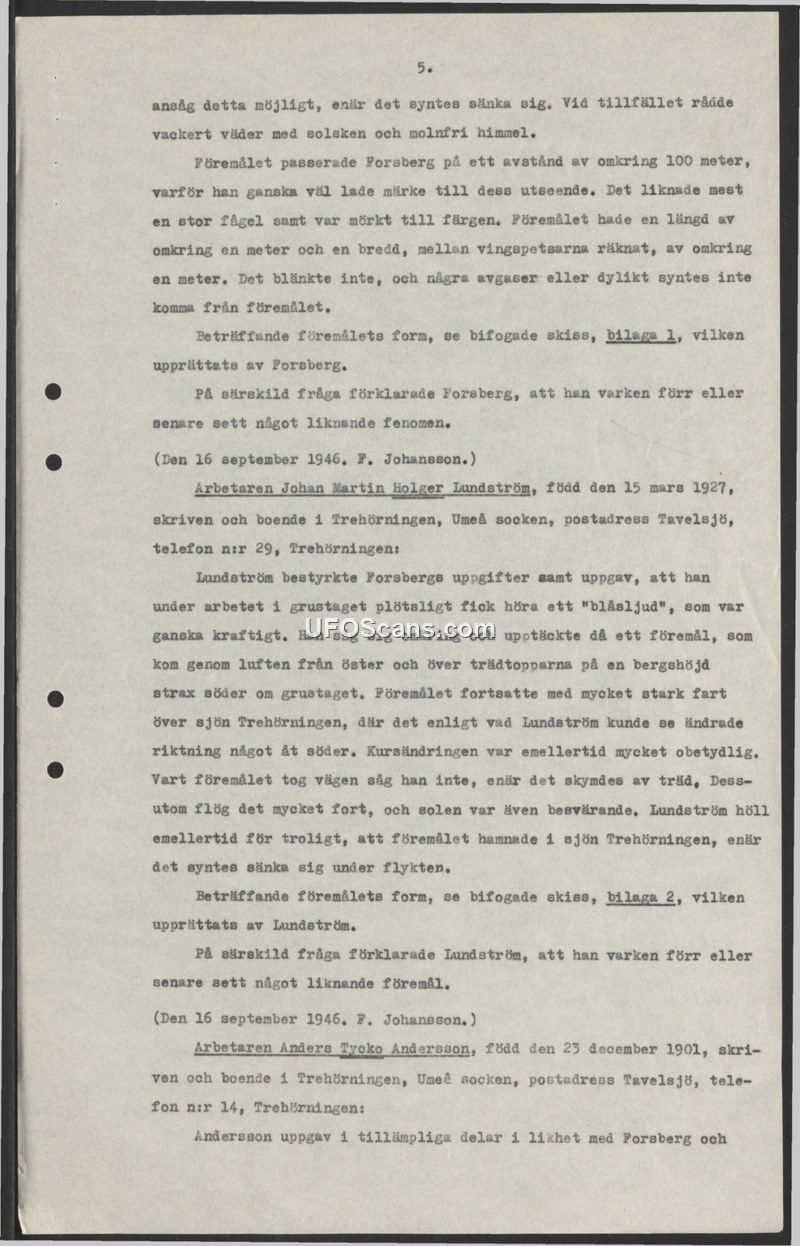 Sighting Report: Forsberg, Lundström, and Andersson, Trehörningen, 1946