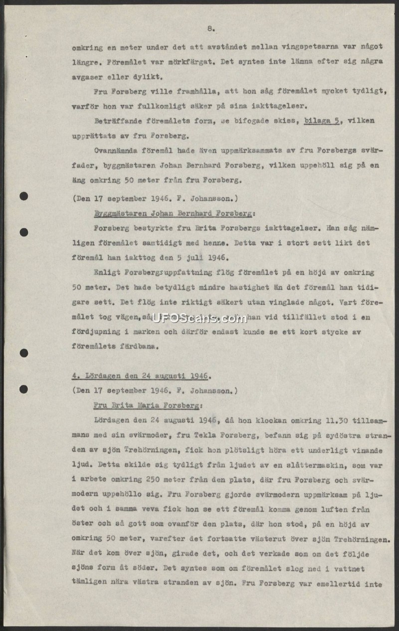 Sighting Report: Observations by Brita and Johan Bernhard Forsberg, 1946