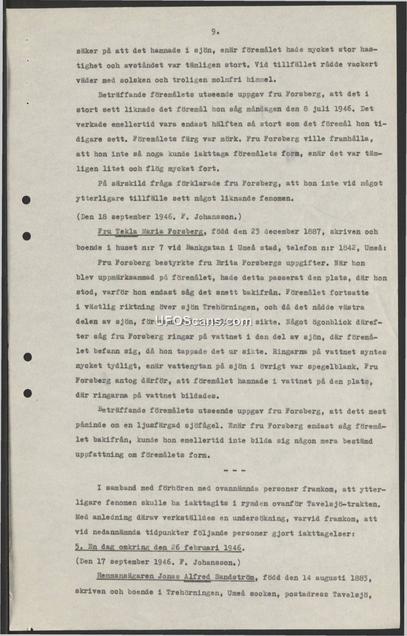 This document is a field report dated September 1946, authored by F. Johansson, detailing witness accounts of unidentified aerial phenomena in the Umeå and Tavelsjö regions of Sweden. The report focuses on the testimony of Tekla Maria Forsberg, who observed an object on July 8, 1946. She described the object as dark in color, small, and moving at a very high speed. She noted that it resembled a light-colored seabird, though she could not clearly discern its form due to its speed and distance. Upon reaching the western part of Lake Trehörningen, the object disappeared from sight. Shortly thereafter, Mrs. Forsberg observed rings forming on the otherwise mirror-calm surface of the lake, leading her to conclude that the object had entered the water. The report also mentions that an investigation was conducted into additional sightings in the Tavelsjö area, identifying Jonas Alfred Sandström as a witness to a separate event occurring around February 26, 1946.