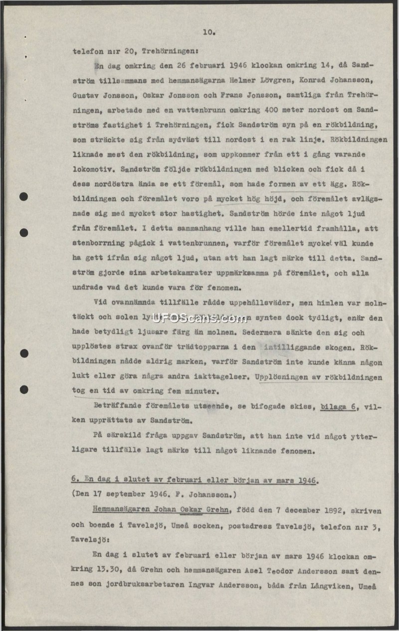 This document contains two separate accounts of aerial phenomena observed in Sweden in early 1946. The first account details an incident on February 26, 1946, at approximately 14:00, in Trehörningen. A witness named Sandström, while working with five other men (Helmer Lövgren, Konrad Johansson, Gustav Jonsson, Oskar Jonsson, and Frans Jonsson) on a water well, observed a smoke formation stretching in a straight line from southwest to northeast. The smoke resembled that of a locomotive. At the northeastern end of this formation, Sandström observed an egg-shaped object at a very high altitude, moving at a high rate of speed. No sound was heard, though the witness noted that stone drilling was occurring nearby, which might have masked any noise. The smoke formation was lighter in color than the surrounding clouds, eventually descended, and dissolved above the treetops within five minutes. Sandström noted that he had not seen similar phenomena before and provided a sketch (Appendix 6). The second account, dated September 17, 1946, by P. Johansson, introduces a witness named Johan Oskar Grehn. Grehn, along with Asel Teodor Andersson and Ingvar Andersson, reported a sighting in late February or early March 1946 at approximately 13:30 in the vicinity of Tavelsjö and Långviken.