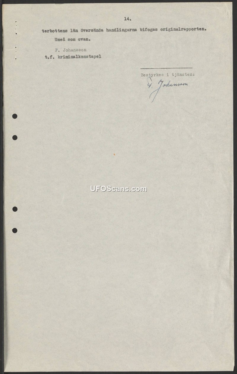 This document is a brief administrative note, numbered 14, originating from Umeå, Sweden. It is signed by F. Johansson, who holds the title of acting criminal constable (t.f. kriminalkonstapel). The text serves as a transmittal notice, indicating that the original report (originalrapporten) is being forwarded regarding matters in Västerbotten County. The document is authenticated with a stamp and signature, confirming it was processed in an official capacity.