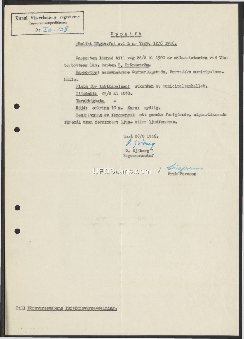 A 1946 Swedish military report documenting a sighting of a cigar-shaped object in Burträsk. The object was observed at low altitude with no associated light or sound.