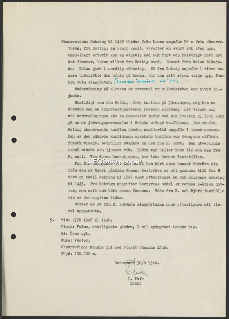 This document is a field report dated August 30, 1946, detailing two separate observations. The first event occurred at 1445 hours, where a witness, Fru Rettig, reported hearing a sharp bang followed by the appearance of black smoke and a high-speed fireball that passed her window. She later discovered white slag pieces at the site. Military staff investigated the incident and compared it to a railway maintenance event involving a repairman named Björk, who had triggered a detonator on the tracks at 1345 hours. The investigators concluded that the event witnessed by Fru Rettig was not the same as the railway detonator, as the timing, sound intensity, and smoke characteristics differed. The second event occurred on August 27, 1946, at 1140 hours in Valme, where a small aircraft was observed flying at an altitude of 100-200 meters with a strong hissing sound, traveling in a westerly direction.