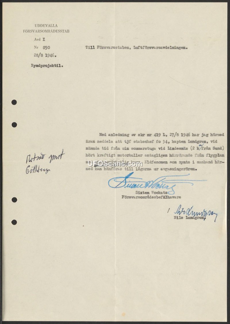 A 1946 Swedish military report documenting a sighting of an object with engine noise and exhaust flames, observed by a Captain near Lindesnäs. The military concluded the object was likely an aircraft.
