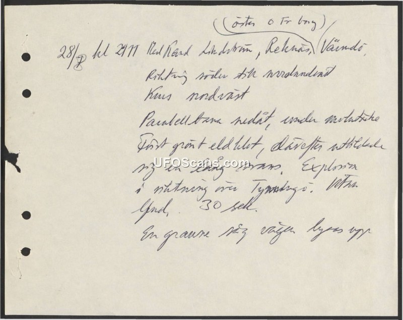 This handwritten document is a brief sighting report dated July 28th at 21:11. The witness, identified as Kard Lindström, observed an object in the vicinity of Reknäs, Värmdö. The object was described as moving from a southerly to a north-easterly direction, with a course set towards the north-west. The witness noted a parallel downward path. Initially, the object appeared as a green light, which subsequently expanded into a long mass. The event concluded with an explosion in the direction of Tynningö. The total duration of the sighting was recorded as 30 seconds.
