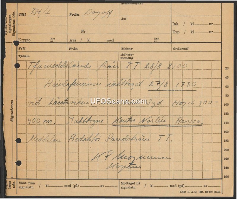 Sighting Report - Lårstaviken, August 27, 1945