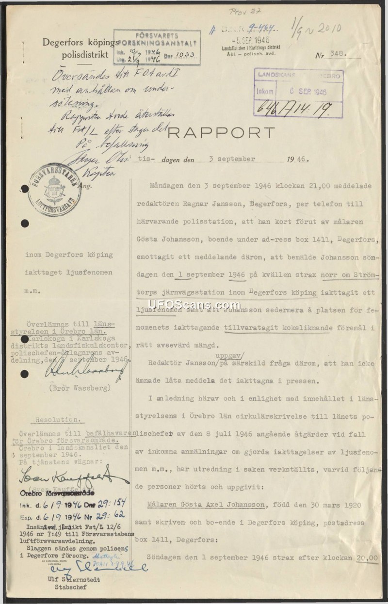 att bemälde Johansson söndagen den 1 september 1946 på kvällen strax norr om Strömtorps järnvägsstation inom Degerfors köping iakttagit ett ljusfenomen samt att Johansson sedermera å platsen för fenomenets iakttagande tillvaratagit koksliknande föremål i rätt avsevärd mängd.
