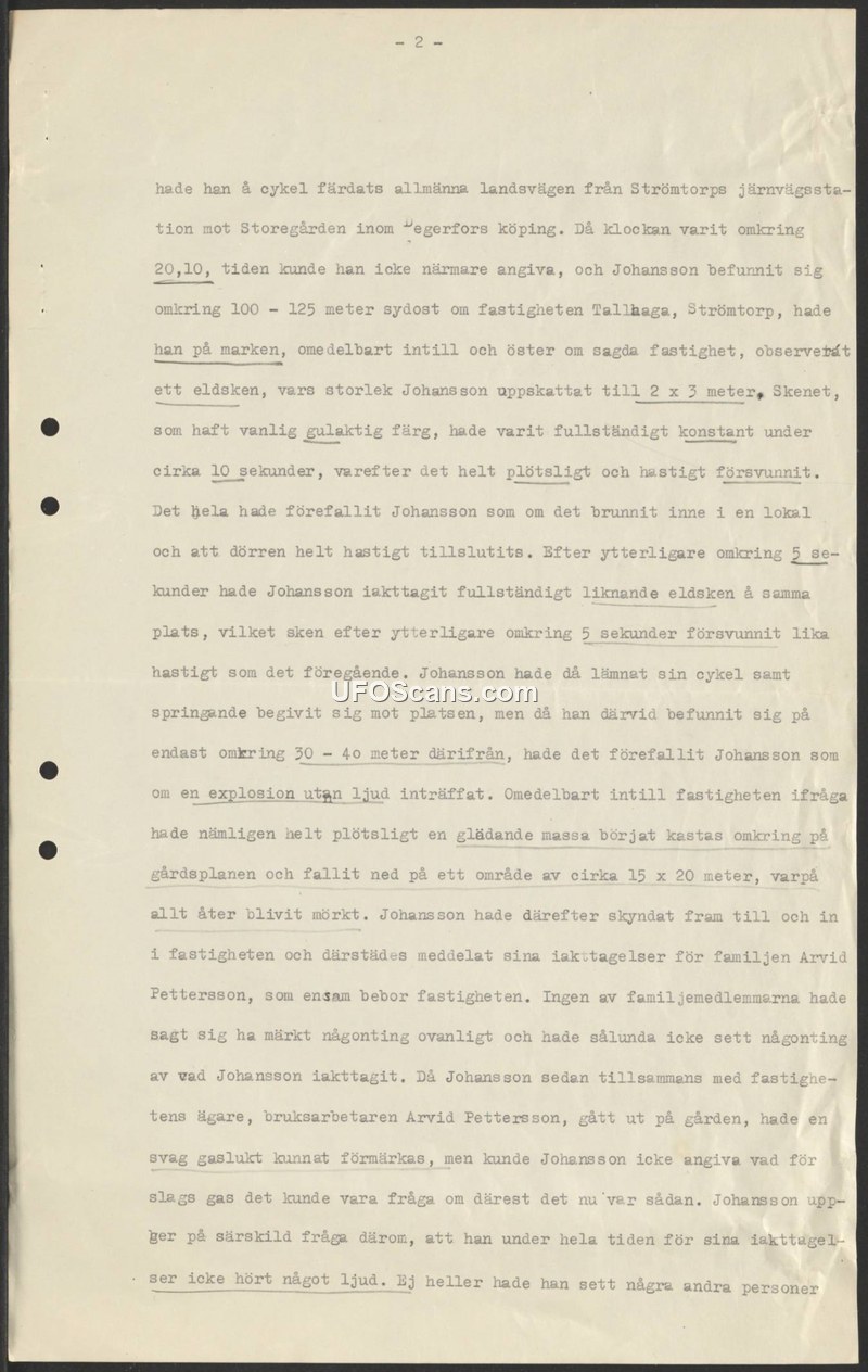 This document details a sighting reported by an individual named Johansson. While cycling on the public road from the Strömtorp railway station toward Storegården in Degerfors, at approximately 20:10, Johansson observed a light near the property of Tallhaga. The light, estimated to be 2 by 3 meters in size and yellowish in color, remained constant for about 10 seconds before disappearing. After approximately 5 seconds, a similar light appeared in the same location for another 5 seconds before vanishing again. Johansson left his bicycle and ran toward the site. When he was 30 to 40 meters away, he experienced what he described as a silent explosion. A glowing mass was suddenly scattered across the courtyard, covering an area of approximately 15 by 20 meters, after which the area became dark. Johansson then entered the property and informed the resident, Arvid Pettersson, of his observations. The family members reported seeing nothing unusual. Upon inspecting the courtyard with Pettersson, a faint smell of gas was noted, though the nature of the gas could not be identified. Johansson explicitly stated that he heard no sound during the entire event and did not see any other people.