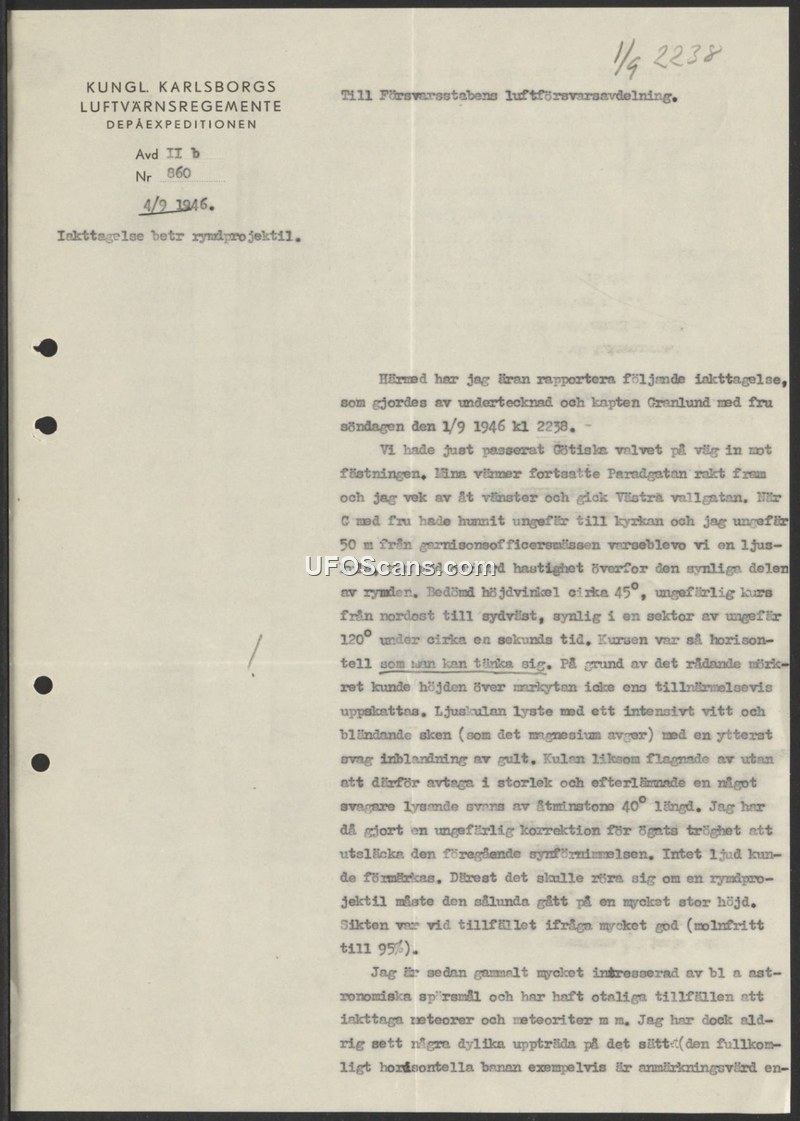 A 1946 Swedish military report describes a high-speed, horizontal, luminous aerial object observed by three witnesses. The observer, citing experience with meteors, notes the object's behavior was anomalous.