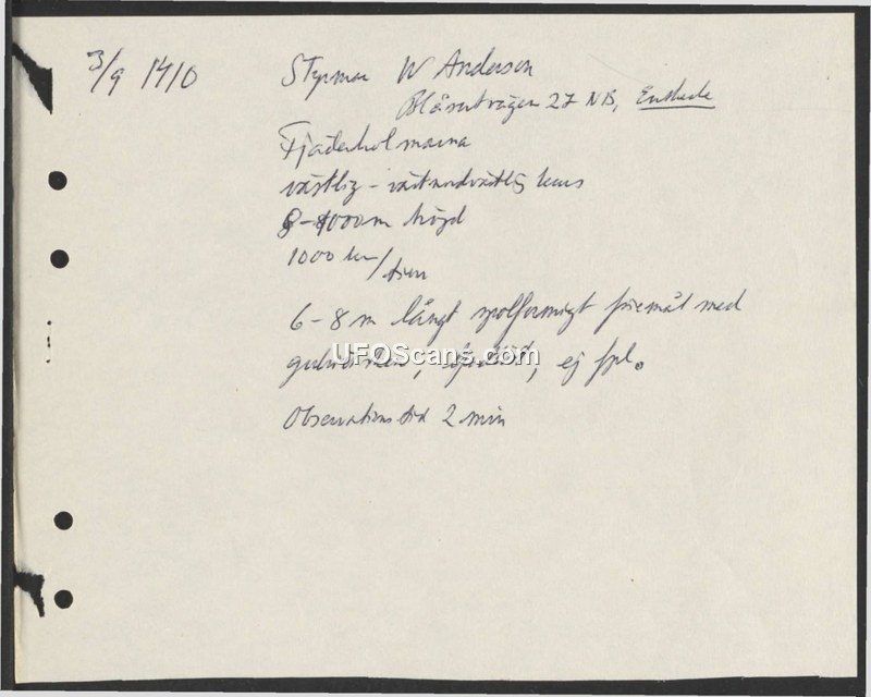 A handwritten report by Styrman W. Anderson detailing the observation of a silent, spool-shaped, glowing object traveling at 1,000 km/h over Fjäderholmarna.