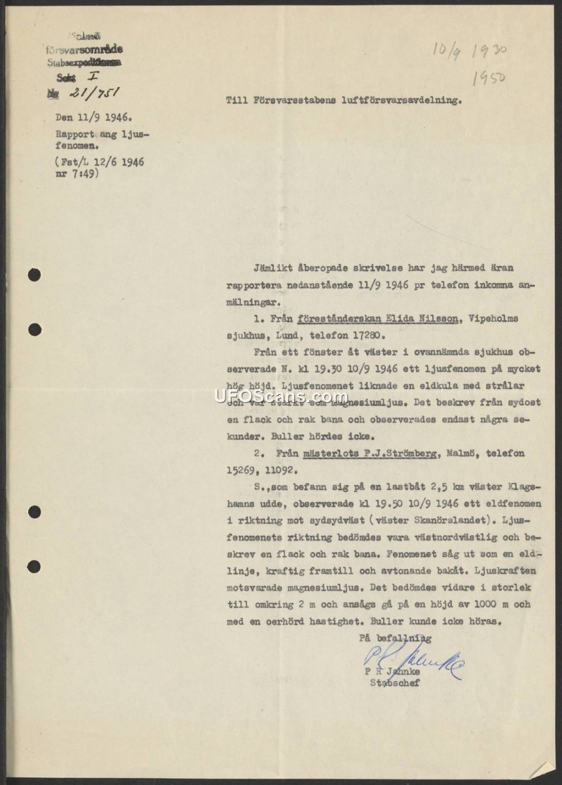 This document is an official report from the Swedish Defence Staff (Försvarsstaben), dated September 11, 1946, addressed to the Air Defence Department. It details two separate reports of light phenomena observed on the evening of September 10, 1946. The first report came from Elida Nilsson, a superintendent at Vipeholms Hospital in Lund. At 19:30, she observed a light phenomenon at a very high altitude from a west-facing window. She described it as a fireball with rays, as bright as magnesium light, moving in a flat and straight path for only a few seconds. No sound was heard. The second report was provided by Master Pilot P.J. Strömberg, who was on a boat 2.5 km west of Klagshamns udde. At 19:50, he observed a fire phenomenon moving towards the southwest. He described the object as looking like a line of fire, powerful in the front and fading towards the back, with a brightness comparable to magnesium light. He estimated the object to be approximately 2 meters in size, traveling at an altitude of 1000 meters with tremendous speed. Like the first witness, he reported that no sound was heard. The document is signed by P. R. Jahnke, Chief of Staff.
