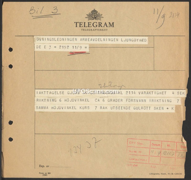 A telegram from the Swedish Army Training Command at Ljungbyhed reporting a 4-second sighting of a yellow-red light on September 11, 1946.