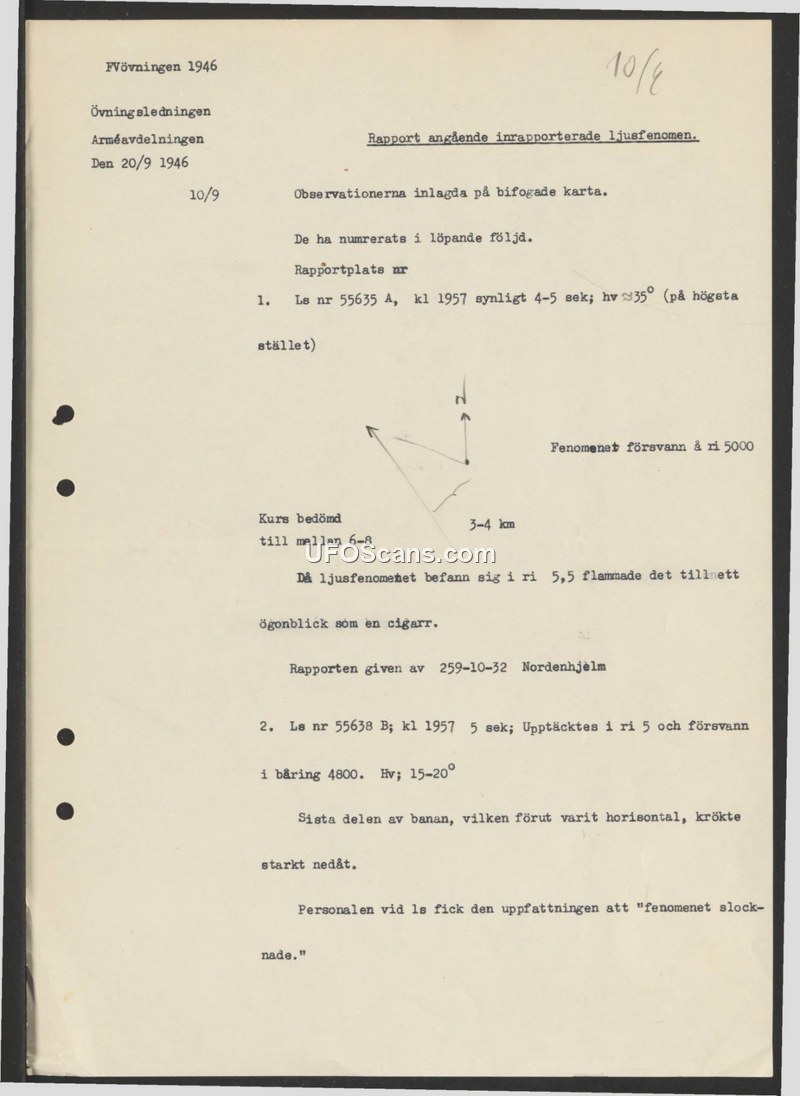 A 1946 Swedish military report detailing two distinct light phenomena observed at 1957 hours, including one that flared like a cigar and another that performed a sharp downward maneuver.