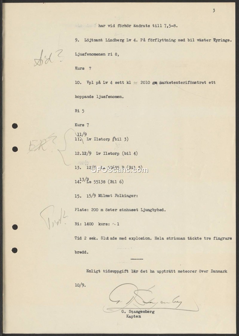 The document lists several light phenomena sightings, with a specific report from Milmet Folkinger on September 15th involving a light phenomenon that ended in an explosion. The author notes that reports of meteors over Denmark on September 10th may be relevant.