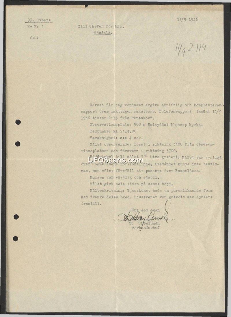 This document is a formal written report dated September 12, 1946, submitted by S. Skoglundh, a unit commander (Förbandschef) of an anti-aircraft battery (lvbatt). The report serves as a follow-up to a telephone report submitted on September 11, 1946, at 21:35, regarding the sighting of a 'rocket bomb' (raketbomb). The observation took place at 21:14 on September 11, 1946, from a location 500 meters east-southeast of Ilstorp church. The object was visible for approximately four seconds. It was first observed at a bearing of 3400 and disappeared at a bearing of 3700. The elevation angle was noted as 3 degrees. The object was visible above the horizon line of Rommelåsen, and although the distance could not be determined, it appeared to pass over the ridge. The object maintained a stable westerly course and remained at a constant altitude throughout the observation. The witness described the object as having a pear-like shape with a broad front. The light emitted by the object was described as yellow-red, appearing lighter at the front.