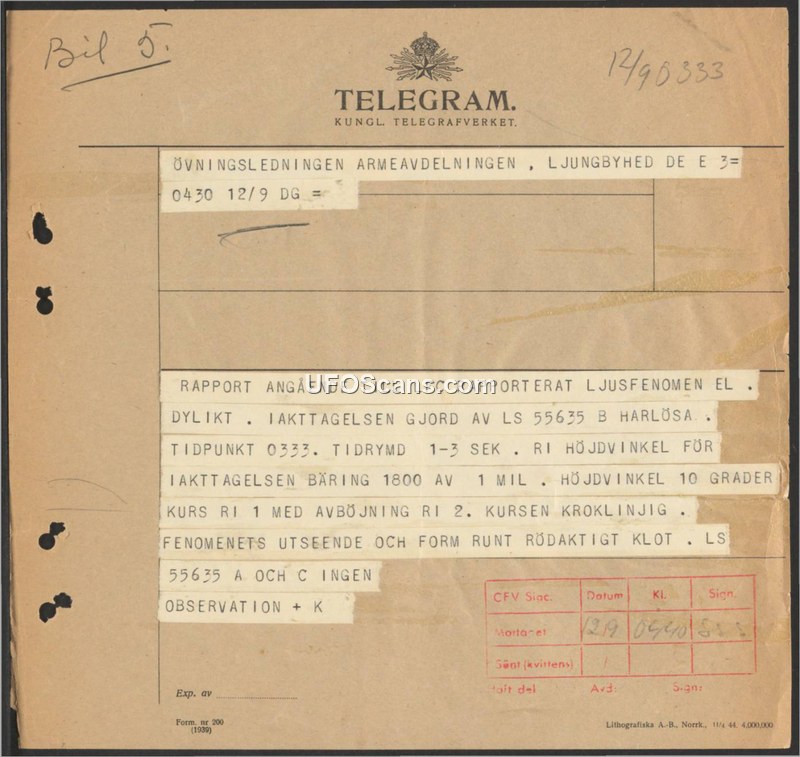 Telegram Regarding Luminous Phenomenon Sighting — Ljungbyhed, Sweden, September 12, 1944