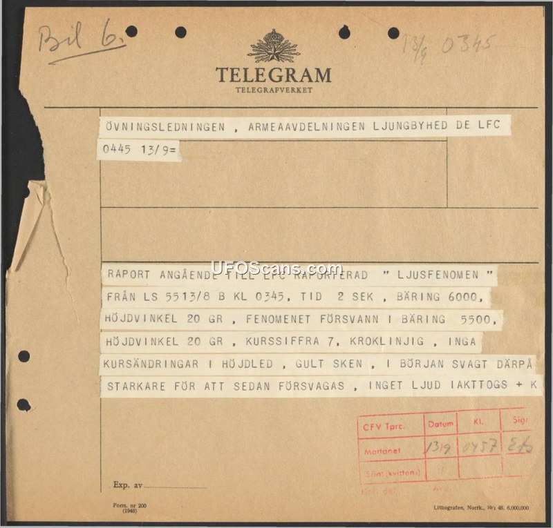 A telegram from 1946 reporting a two-second observation of a yellow light phenomenon in Sweden. The object moved in a curved path at a constant elevation of 20 degrees without making any sound.
