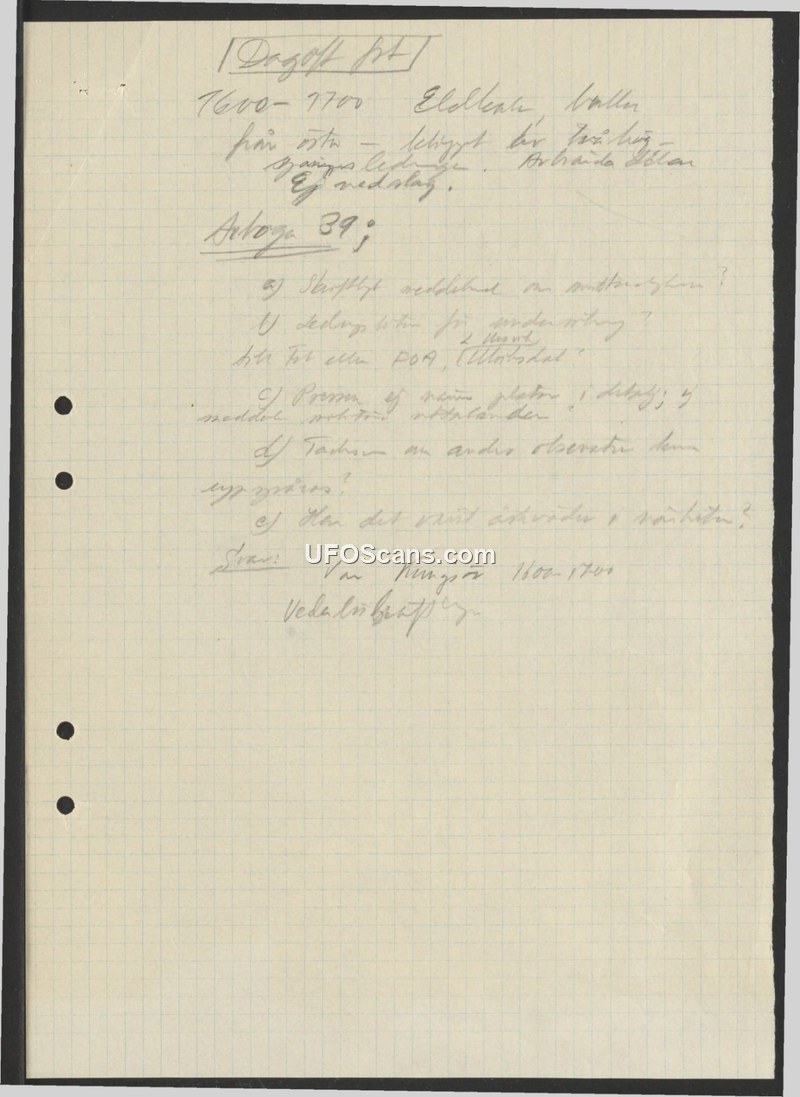 This document is a brief, handwritten field report concerning an aerial observation at Dagö. The report covers the time period between 1600 and 1700 hours. The object was observed coming from the east. The report explicitly notes that there was no impact (Ej nedslag). The document also contains a list of questions labeled 'Anlaga 39' (Annex 39), which appear to be standard inquiry questions regarding the incident, such as whether there was a written report, if there were leads for investigation, whether the press was involved, if other observers were present, and if there were any witnesses in the vicinity. The document concludes with a brief reference to the time 1600-1700.