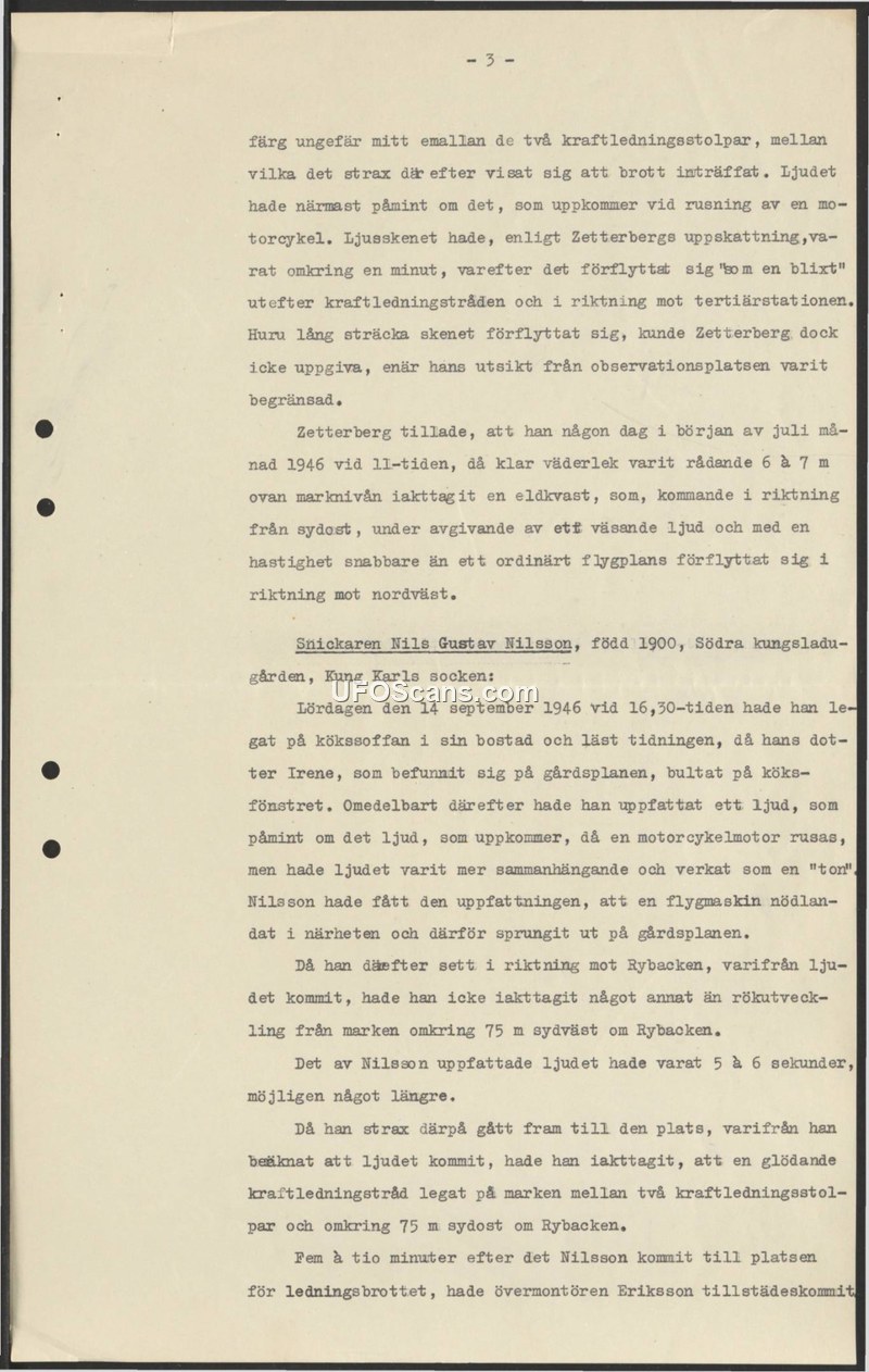 This document contains two accounts of unidentified aerial phenomena observed in Sweden in 1946. The first account, provided by a witness named Zetterberg, describes an event in early July 1946. Zetterberg observed a 'fire tail' (eldkvast) moving from the southeast to the northwest at an altitude of 6 to 7 meters. The object emitted a hissing sound and traveled at a speed faster than a conventional airplane. Zetterberg also describes a separate incident involving a light that moved like a 'lightning bolt' along power lines toward a substation, though he could not determine the distance due to limited visibility. The second account is provided by Nils Gustav Nilsson, a carpenter from Kung Karls socken. On September 14, 1946, at 16:30, Nilsson heard a sound resembling a revving motorcycle engine, which he initially mistook for a plane crash. Upon investigating the area near Rybacken, he observed smoke rising from the ground and discovered a glowing power line lying on the ground between two utility poles. The sound he heard lasted approximately 5 to 6 seconds. A technician, Eriksson, arrived at the scene shortly after Nilsson to address the power line damage.