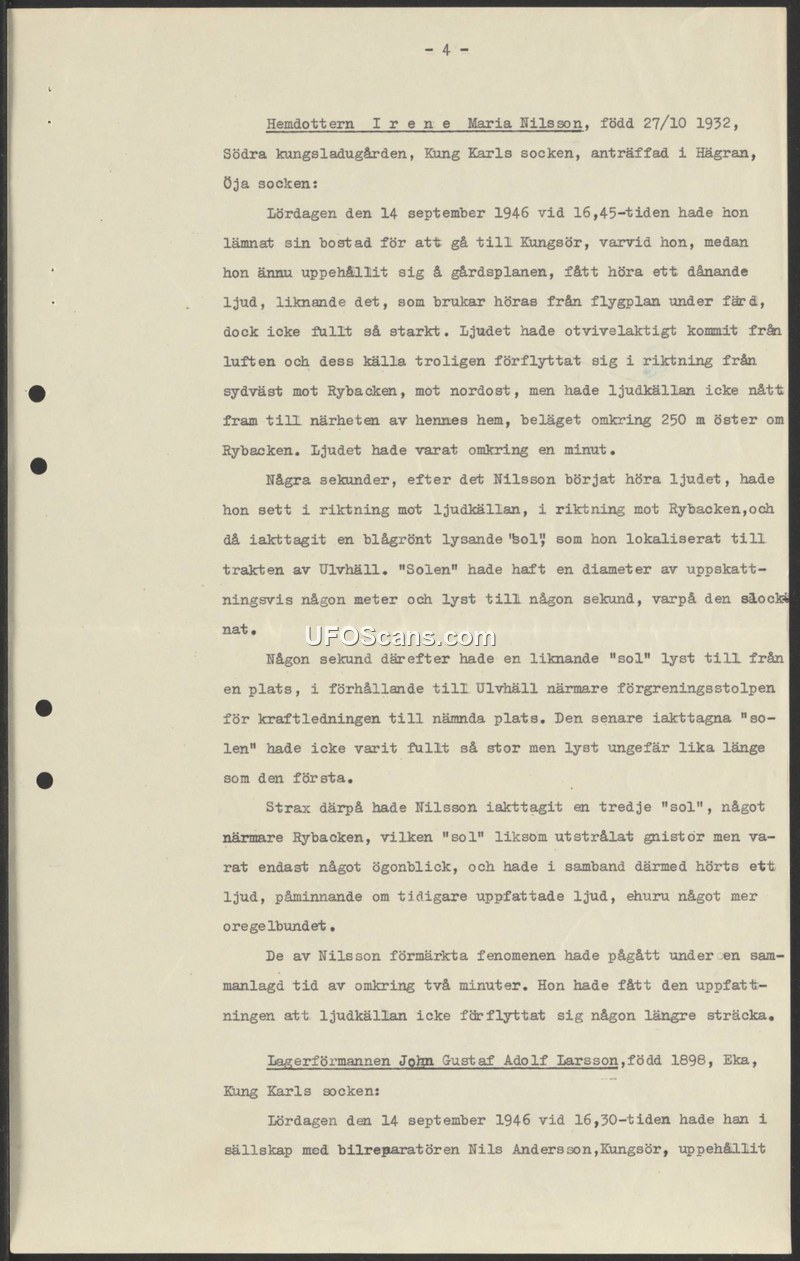 On September 14, 1946, at approximately 16:45, Irene Maria Nilsson, a resident of Södra Kungsladugården, Kung Karl parish, observed a series of phenomena while in Hägran, Öja parish. Nilsson reported hearing a roaring sound, comparable to an airplane in flight but less intense, which seemed to originate from the air and move from the southwest toward the northeast. The sound lasted for about one minute. Shortly after the sound began, Nilsson observed a blue-green 'sun' in the direction of Rybacken, localized near Ulvhäll. This object was estimated to be a few meters in diameter and lasted for about a second before extinguishing. A second, similar 'sun' appeared shortly thereafter from a location closer to a power line branch point; it was smaller but lasted for a similar duration. A third 'sun' was then observed closer to Rybacken, which appeared to radiate sparks for a brief moment, accompanied by a sound similar to the previous one, though more irregular. The entire event lasted approximately two minutes. Nilsson concluded that the source of the sound had not traveled a significant distance. The document also begins to introduce the testimony of warehouse foreman John Gustaf Adolf Larsson, who was in the company of car mechanic Nils Andersson at 16:30 on the same day, though the text cuts off before his account is provided.