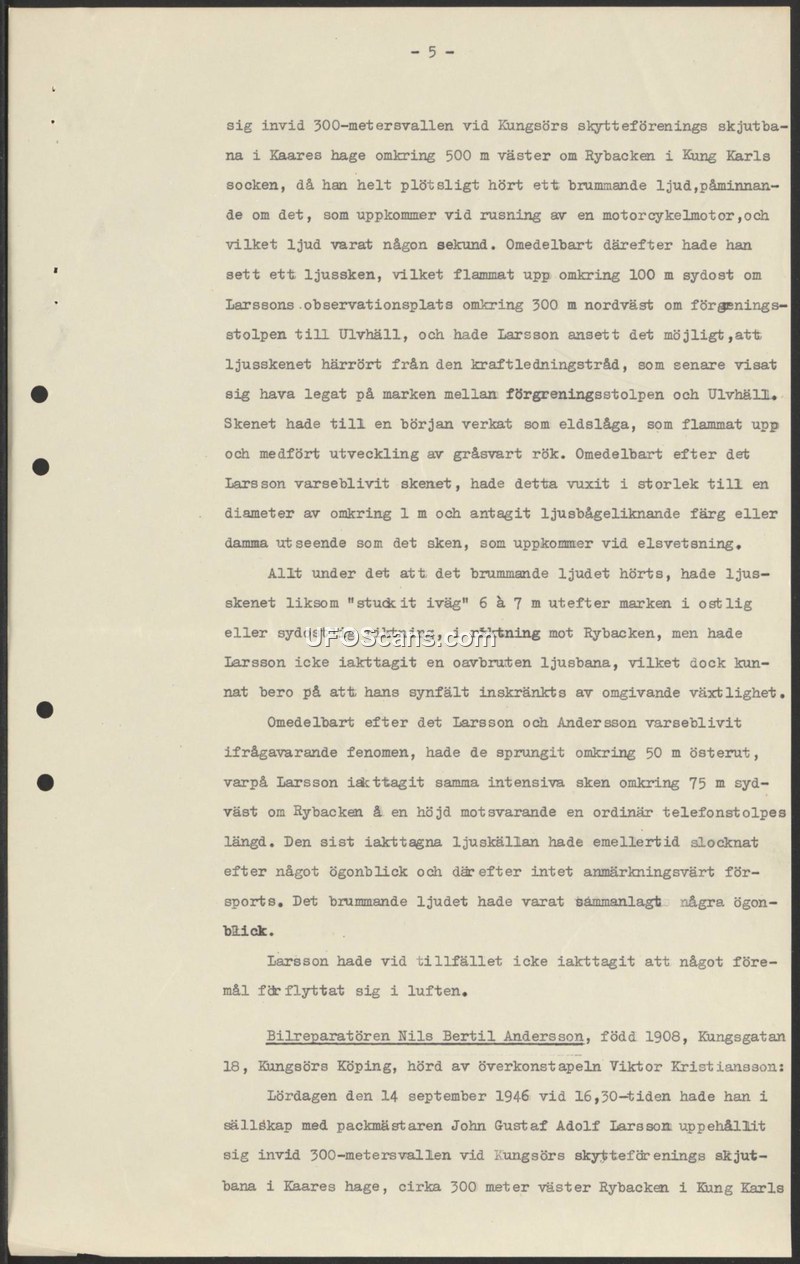 On September 14, 1946, at approximately 16:30, Nils Bertil Andersson and John Gustaf Adolf Larsson were present at the Kungsör shooting range in Kaares hage, Sweden. While at the 300-meter embankment, they heard a humming sound described as similar to a revving motorcycle engine. Larsson observed a light that initially appeared to be a power line on the ground, which then flared up with gray-black smoke. The light grew to a diameter of approximately one meter and exhibited a color and appearance similar to an electric welding arc. The light moved six to seven meters along the ground in an east or southeast direction toward Rybacken. Although Larsson did not observe a continuous path of light, he attributed this to the surrounding vegetation. The two men then ran 50 meters to the east, where Larsson observed the same intense light at a height equivalent to a telephone pole, approximately 75 meters southwest of Rybacken. The light source extinguished shortly thereafter. Larsson noted that he did not observe any physical object moving through the air during the event.