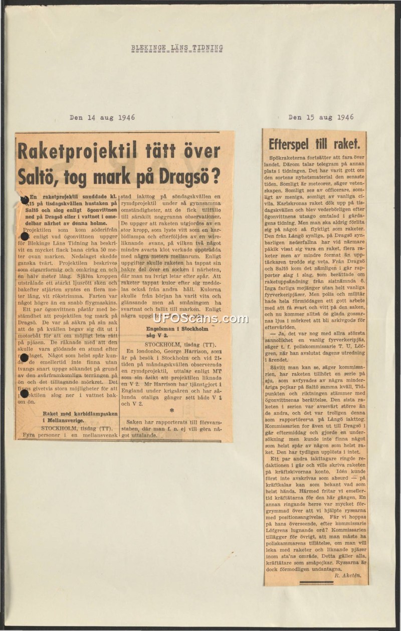 This document from the Blekinge Läns Tidning, dated August 14 and 15, 1946, reports on a series of sightings of 'ghost rockets' in Sweden. The primary incident involves a cigar-shaped object observed on a Tuesday evening, flying from the south over Saltö at an altitude of approximately 50 meters. Witnesses described the object as having a bright red light and a long white smoke trail, moving faster than a typical airplane before appearing to crash near Dragsö. Despite an immediate search by witnesses using a motorboat, no physical evidence was recovered. The article also mentions other sightings, including a report from a Londoner named George Harrison, who compared the object to a V2 rocket. However, the follow-up report on August 15 clarifies that the 'ghost rocket' sightings in this specific instance were likely a series of seven fireworks launched by local youths on Saltö. Acting Police Commissioner T. U. Löfgren confirmed that the timing and direction of the fireworks matched the witness reports, and that no evidence of a genuine rocket was found during his investigation. The article concludes by noting that while some sightings are attributed to meteors or military activity, this specific case was a matter of unauthorized fireworks.