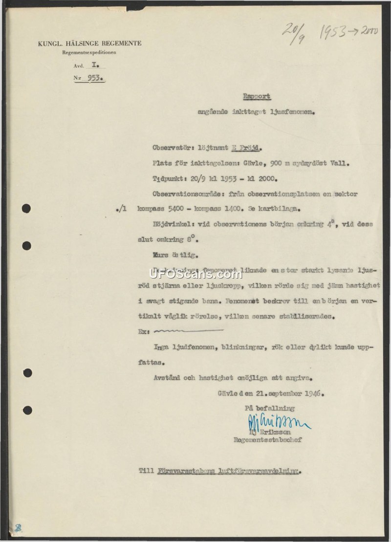 A 1953 report from the Royal Hälsinge Regiment details a sighting of a large, light-red, star-like object that exhibited vertical wave-like motion before stabilizing. The report was submitted to the Swedish Defense Staff for review.