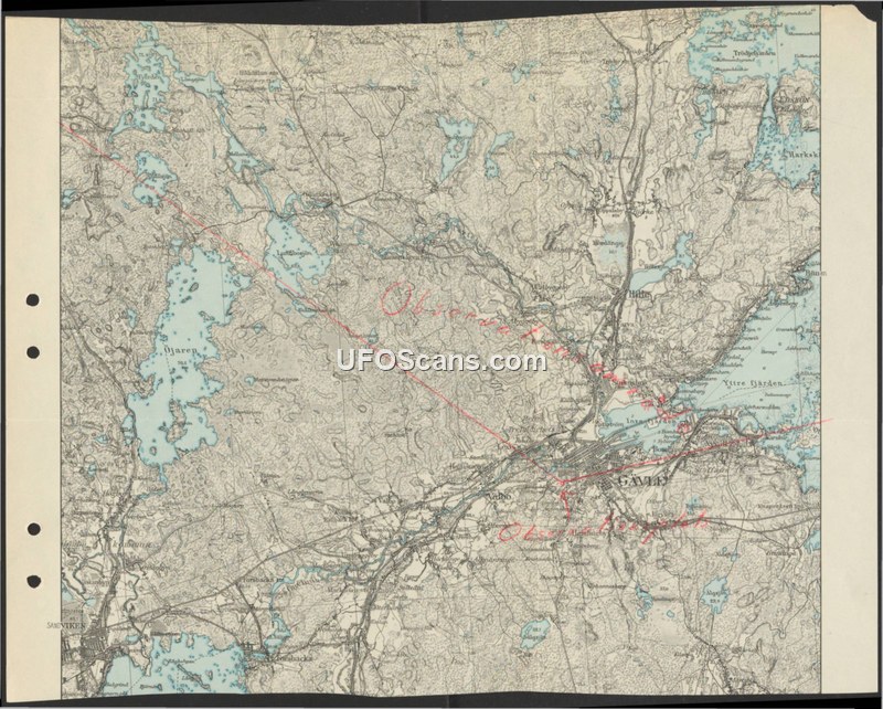 The document is a topographic map of the Gävle region in Sweden. It features handwritten red ink annotations, specifically the word 'Observation' written across the map, indicating a path or area of interest. The map provides detailed geographic information including lakes, forests, and the urban layout of Gävle. No specific date, author, or descriptive text regarding a UAP event is provided beyond the handwritten annotations on the map surface.