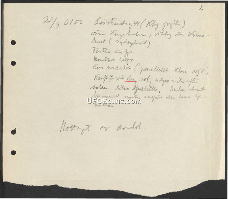 A short, handwritten Swedish field note from September 22nd at 0100 hours reporting an unidentified object moving north-southwest. The document is brief and lacks specific location or observer details.