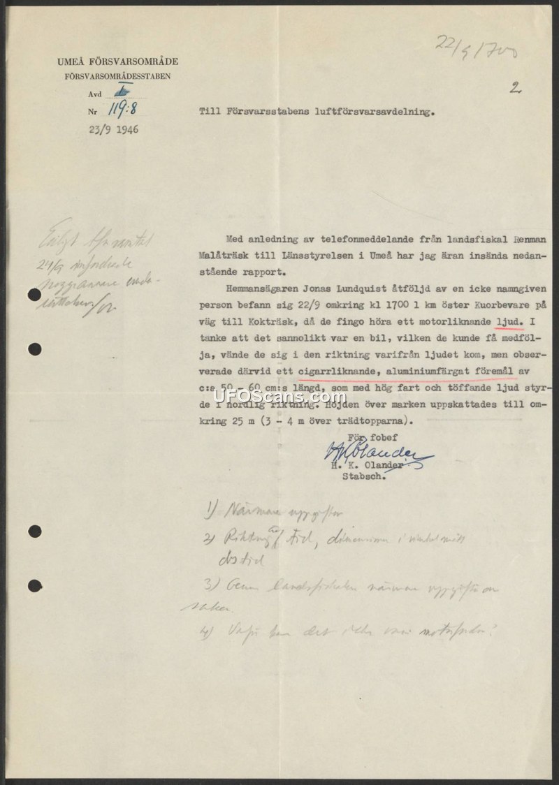 Report on Aerial Sighting near Malåträsk, 22 September 1946