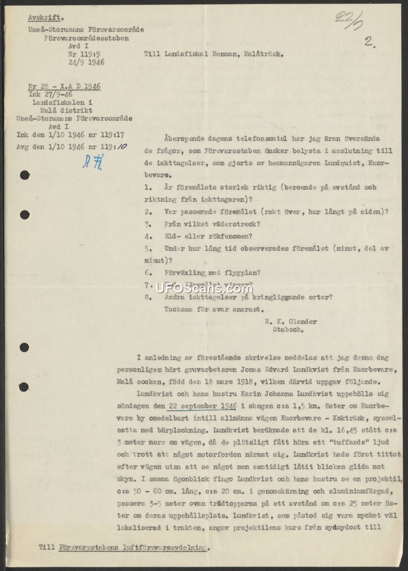 This document consists of two parts: an inquiry from the Umeå-Storumans Defense District staff (dated September 24, 1946) and a subsequent report regarding a sighting by Jonas Edvard Lundkvist. The Defense District staff, acting on behalf of the Defense Staff (Försvarsstaben), requested information from the District Police Superintendent (Landsfiskal) Renman regarding observations made by Lundkvist in Kuorbevare. The inquiry included eight specific questions to clarify the nature of the sighting, such as the size of the object, its trajectory, whether it made any sound, and if it resembled an aircraft. Following this, the document includes a report detailing the personal testimony of Jonas Edvard Lundkvist, a mine worker born in 1916. Lundkvist reported that on Sunday, September 22, 1946, at approximately 16:45, he and his wife, Karin Johanna Lundkvist, were picking berries in the forest about 1.5 km east of Kuorbevare village, near the road to Kokträsk. While standing about 3 meters from the road, they heard a 'tuffande' (puffing or chugging) sound, which they initially mistook for a motor vehicle. Upon looking toward the sky, they observed a projectile approximately 50-60 cm long and 20 cm in diameter. The object was described as aluminium-colored and passed 3-5 meters above the treetops at a distance of about 25 meters from their location. Lundkvist, who claimed to be very familiar with the local terrain, stated that the object's course was from the south-southeast.